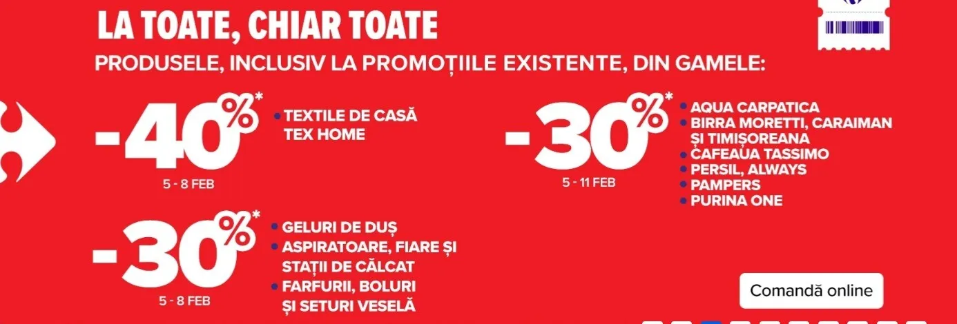 La început de februarie, cei de la Carrefour au o mulțime de reduceri care se aplică direct la casele de marcat. Alte promoții le aduc o bună parte din banii cheltuiți înapoi, sub formă de vouchere valorice. Multe dintre oferte expiră chiar zilele acestea, iar stocurile sunt limitate.
