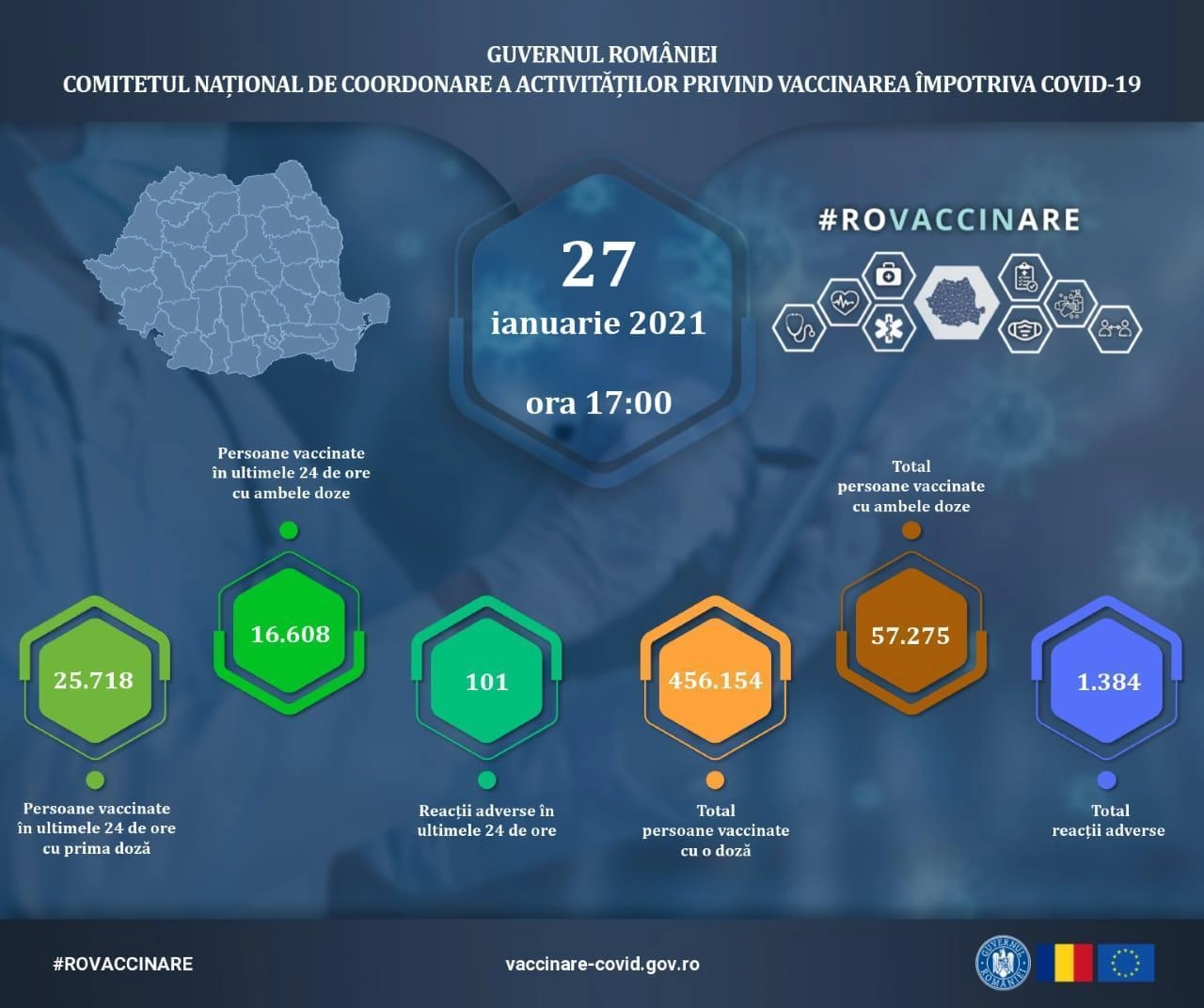 Potrivit datelor puse la dispoziția CNCAV de către Institutul Național de Sănătate Publică, prin aplicația Registrul Electronic Național al Vaccinărilor (RENV), care ține evidența vaccinărilor, situația din ziua de 27 ianuarie a.c., ora 17.00, este următoarea: