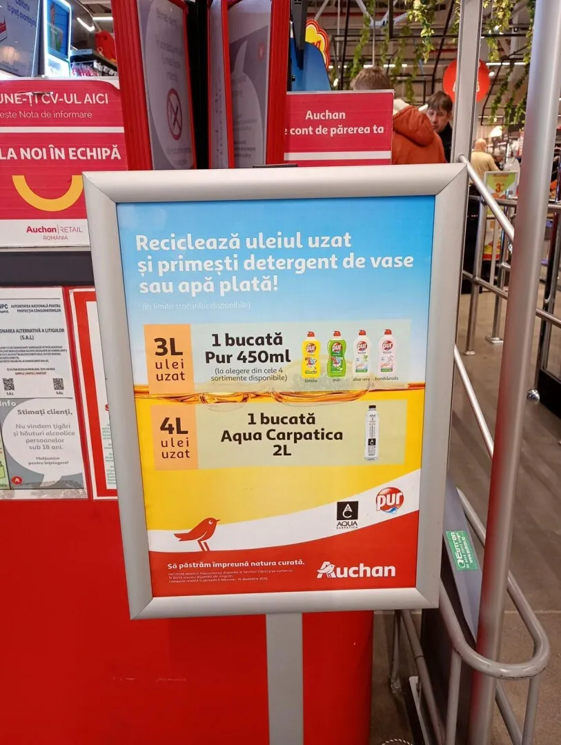 Comerciantul a explicat și procesul de urmat: „Într-un recipient curat, pui uleiul uzat strecurat și neamestecat cu alte deșeuri și apoi îl aduci în unul dintre magazinele Auchan. Mai multe detalii în Regulamentul Oficial al Campaniei, disponibil online dar și fizic, la serviciul Clienți, în magazinele participante”.