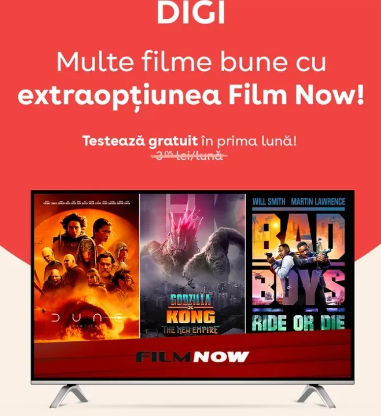Comandă TV Digital cu 30,50 LEI / lună și adaugă la comanda ta și Film Now. Film Now este locul unde pasiunea pentru filme prinde viață! Intră în lumea fascinantă a filmelor de calitate și urmărește o multitudine de producții cinematografice pentru toata familia. Doar 3,05 lei/lună”, au transmis cei de la Digi.