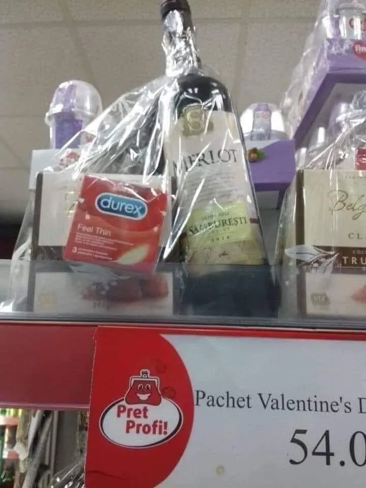 Cine merge la Profi poate cumpăra un pachet de Valentine's Day care conține o sticlă de Merlot de la Sâmburești, o cutie de trufe Belgian și… un pachet de prezervative de la Durex. Practic, supermarketul s-a gândit să lege minimul minimului pentru o noapte romantică. Prețul acestui trio inedit este de 54 de lei. Pentru cine nu crede, iată și poza: