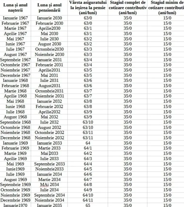 De la data de 1 septembrie 2024 a intrat în vigoare noua lege a pensiilor, care a modificat și tabelul vârstei de pensionare. La vremea respectivă, articol din actul normativ prevede și că din 3 în 3 ani, pot fi înlocuiți acești parametri. În funcție de cum va evolua speranța de viață din România, pot apărea și alte modificări.